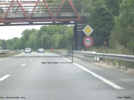 Le radar discriminant est installé sur la chaussée intérieure, juste après la bretelle d'accès à la RN104 Pontault-Combault Centre, devant le pont métallique en fer de couleur orange qui enjambe les voies.